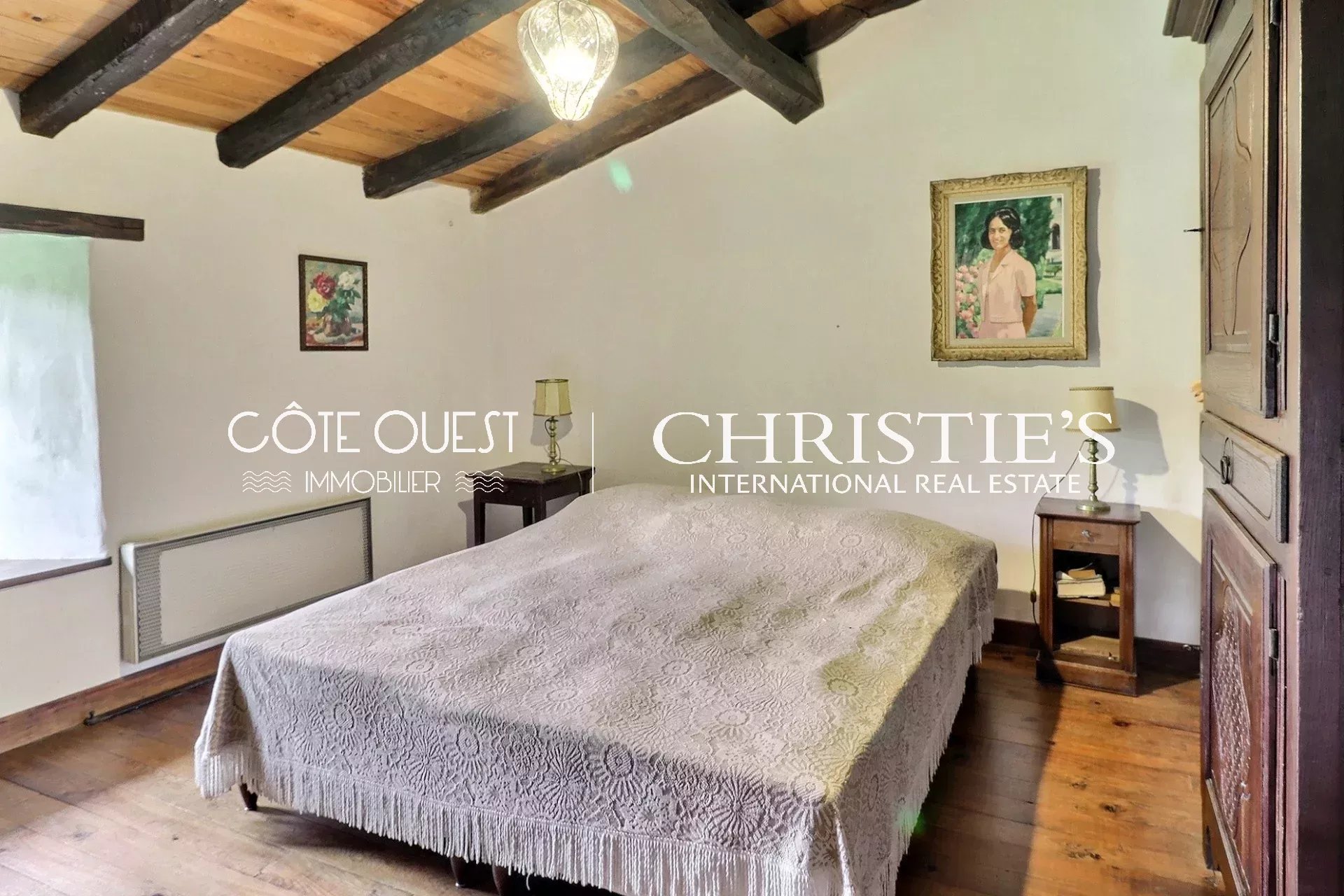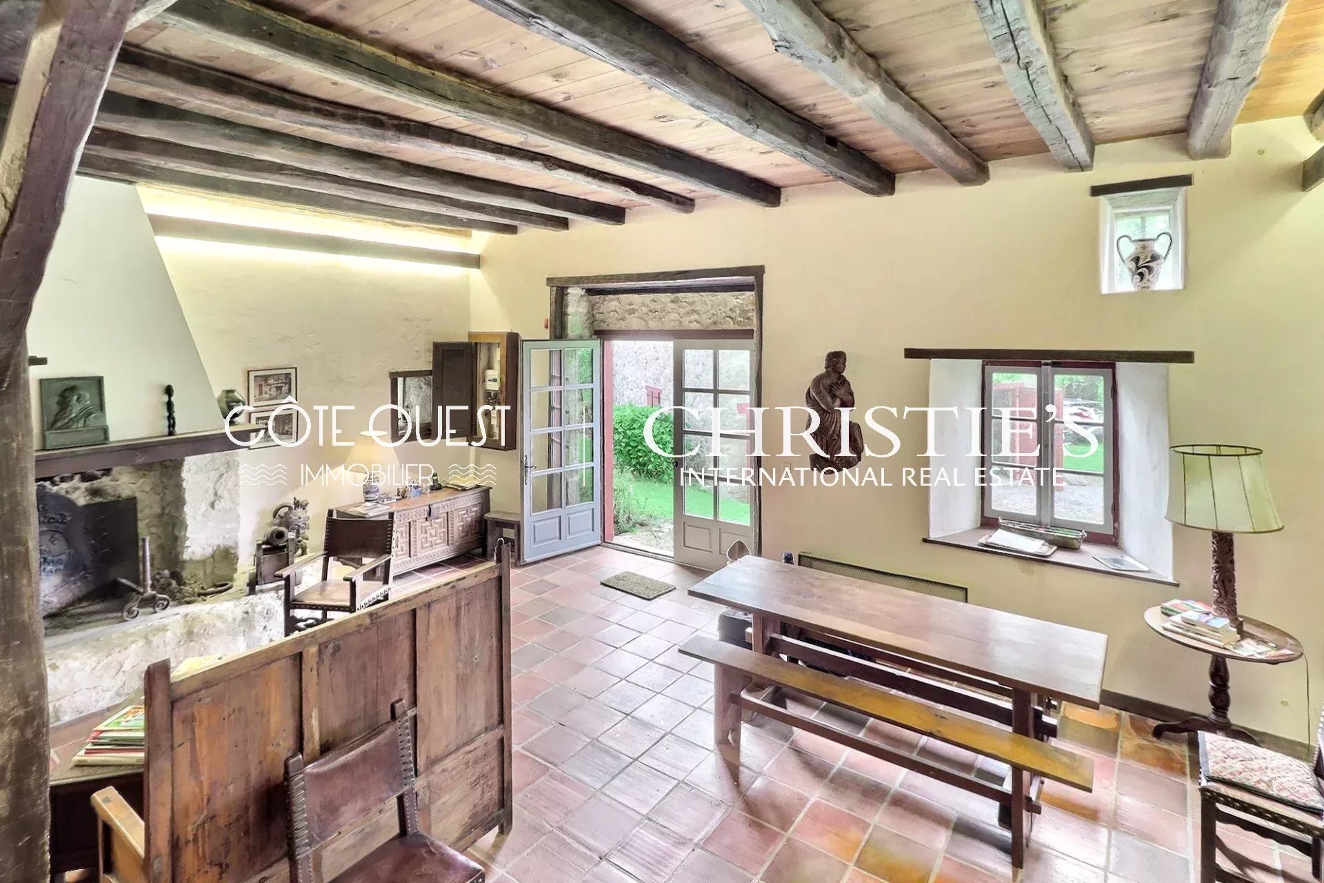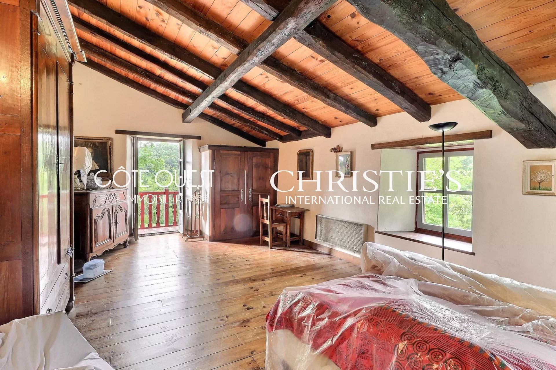 There's a majestic living room with a superb fireplace, a kitchen opening onto the dining room and two charming bedrooms. Upstairs, there are two bedrooms, one with a balcony, and a bathroom. There's also a huge 90 sqm room to be converted as you wish.